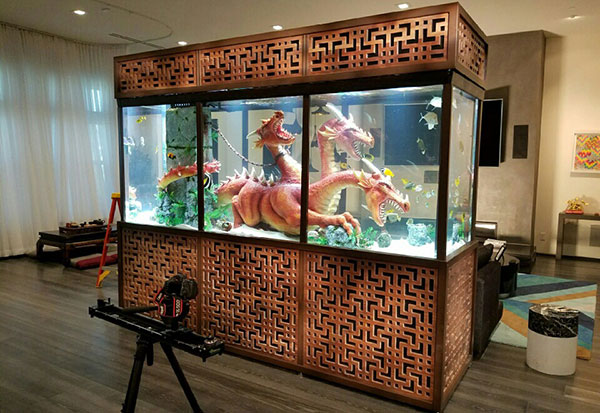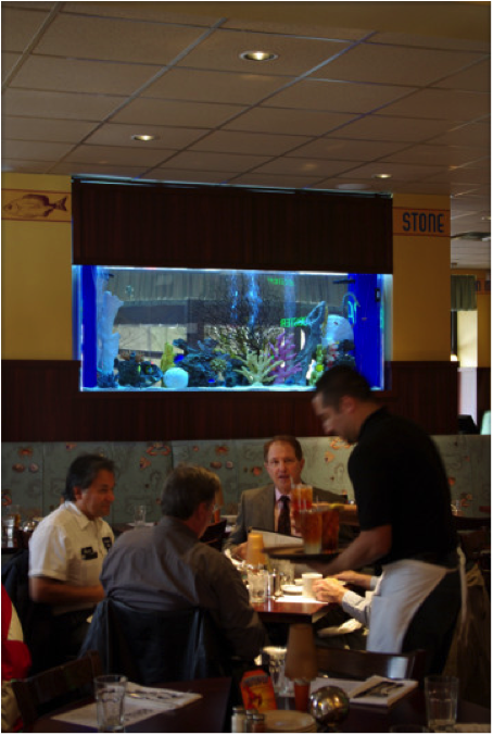 An in-wall aquarium offers smooth lines, streamlined design, and a unique, custom look. However, with an in-wall design, access to the aquarium for maintenance purposes is key. For instance, in our Grande Cheese Company design, there are cabinet doors are above the tank that are flush the wall. Aquarium entry could also take place from behind the aquarium if there’s another room on the other side. Room divider aquariums, depending on height of the tank, may present some of the same concerns.